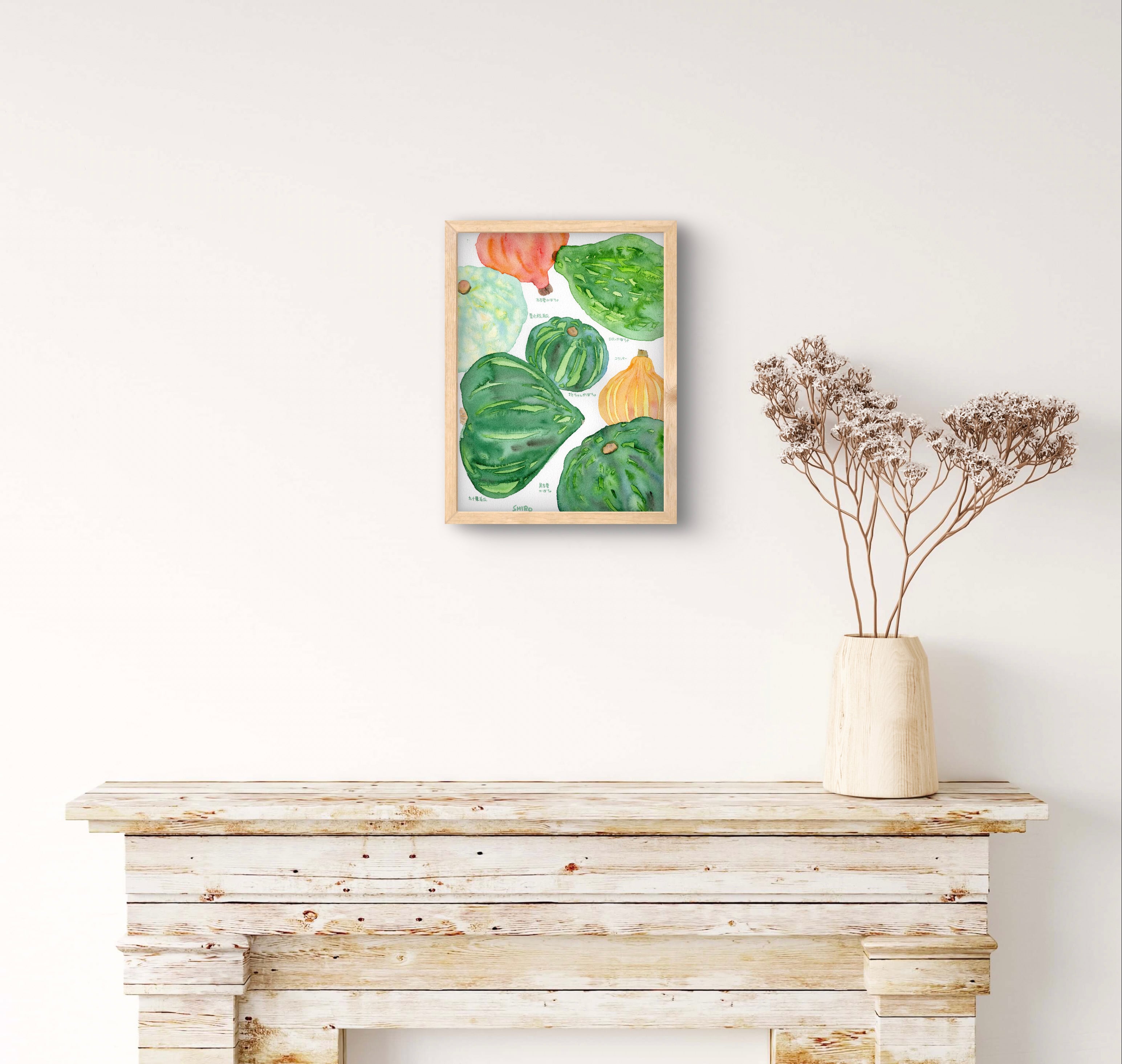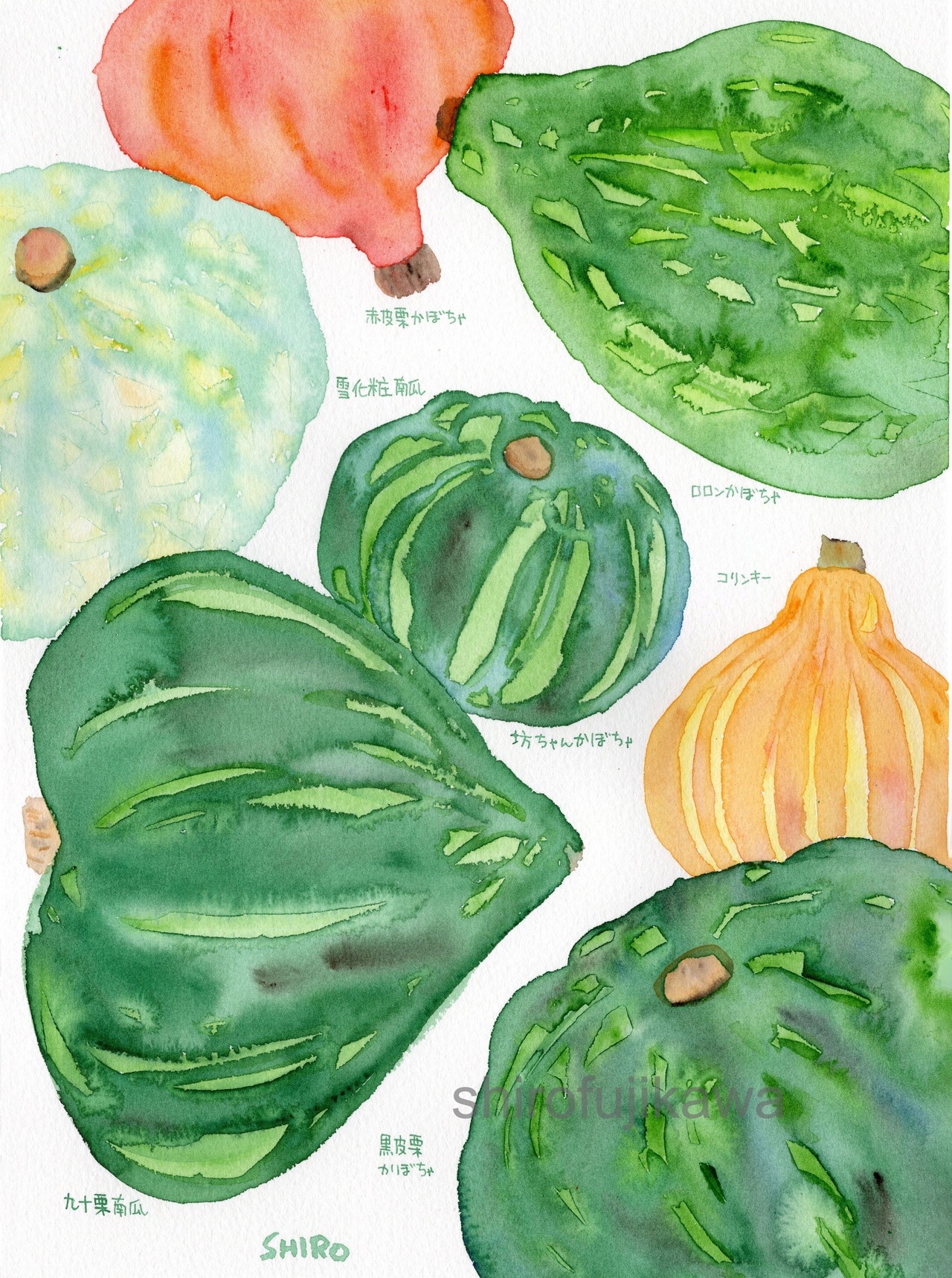 2025年版野菜カレンダーのカボチャの絵です。画面いっぱいにたくさんのカボチャを描きました。なかなかこういう大胆な構図で描くことはないので、ちょっと勇気が要りましたが、うまくできてよかったです。