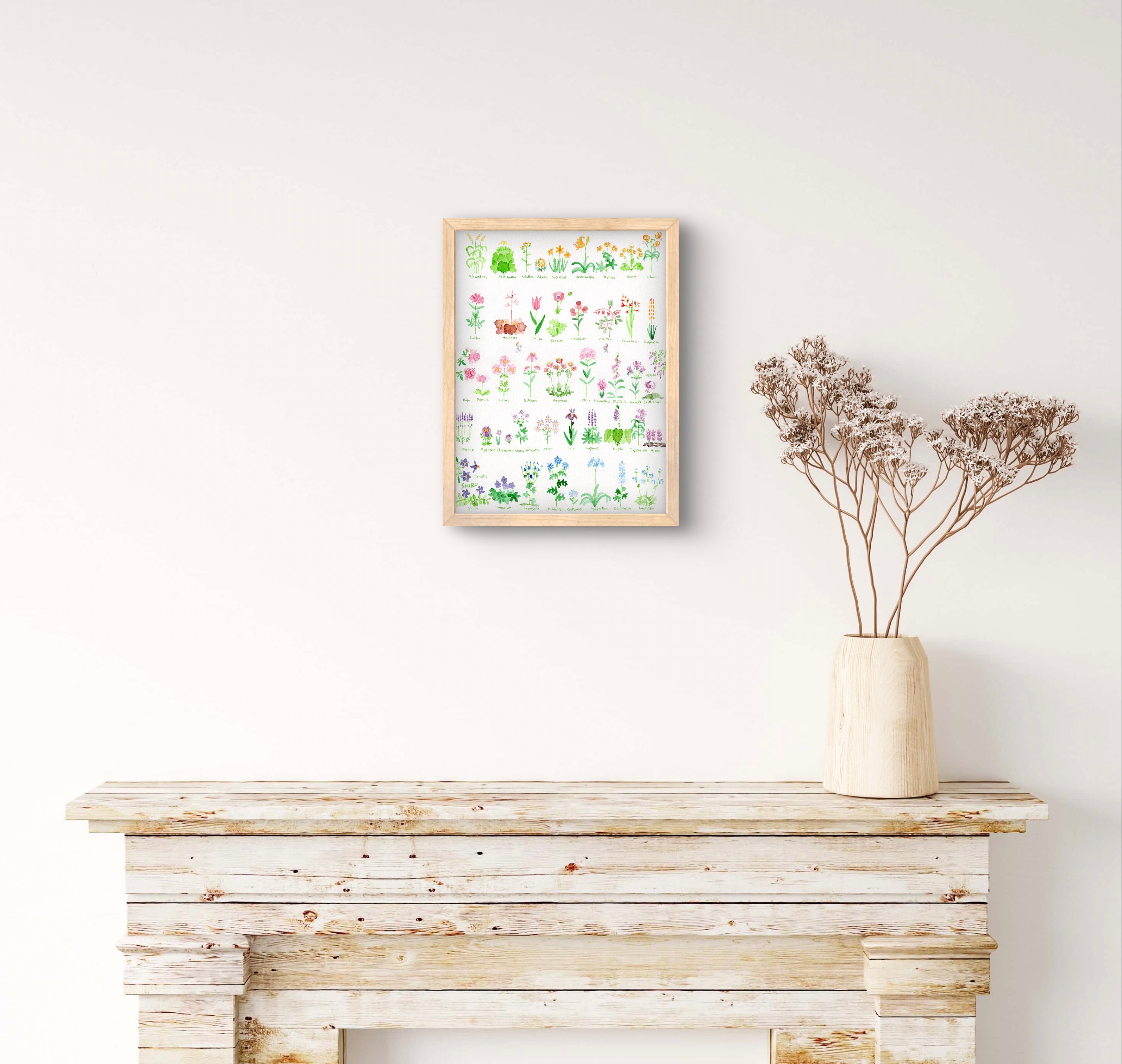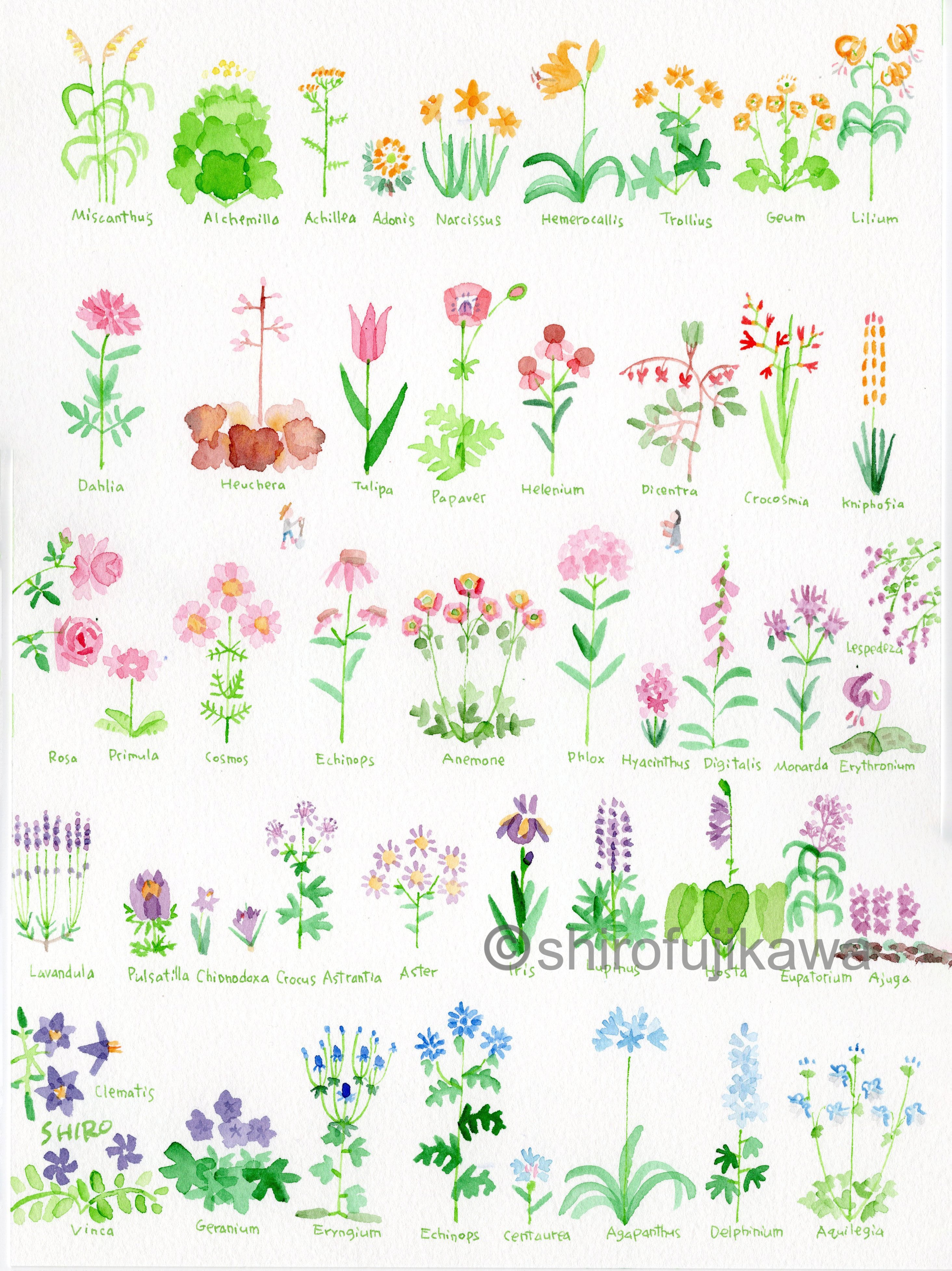 カラー別に花を並べてみました。一番上から黄色、オレンジ、ローズピンク、紫、青のグラデーションになっています。