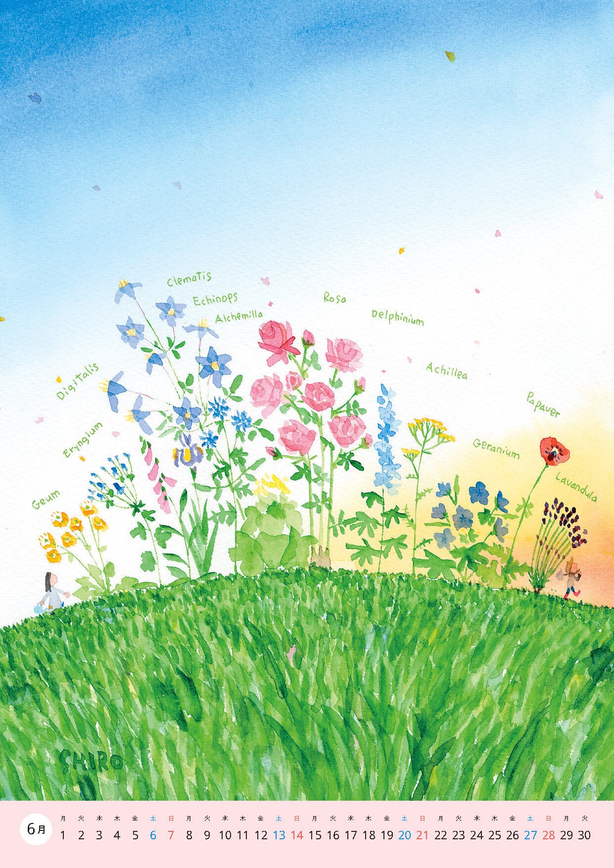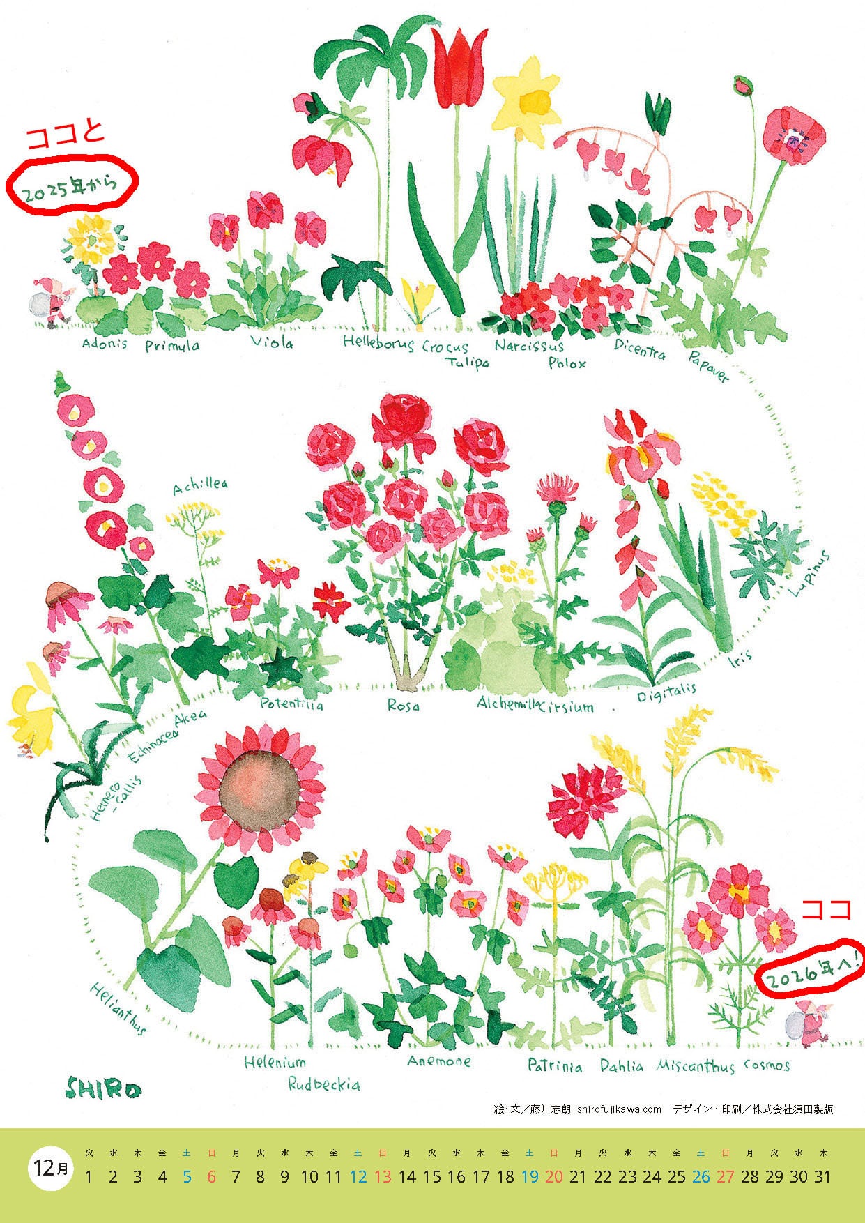 ※12月の絵の中の手書き文字に2つ不都合がありました。「2025年から」ではなく「2026年から」、「2026年へ」ではなく「2027年へ」、が正しいです。2026年12月に見るカレンダーの情報としては不都合ですが、手書き文字も絵の中の一部としてご理解いただけましたら幸いです。