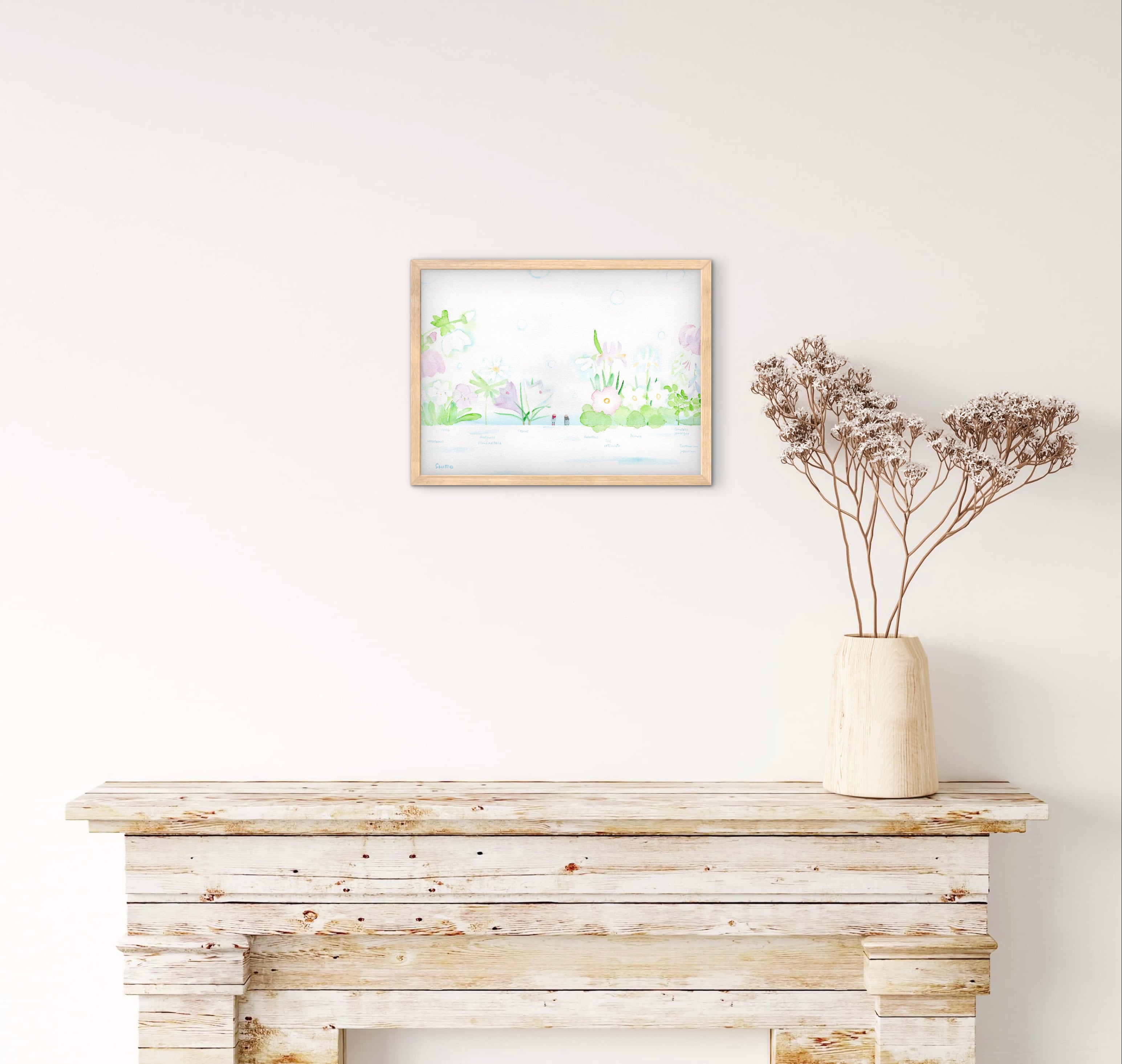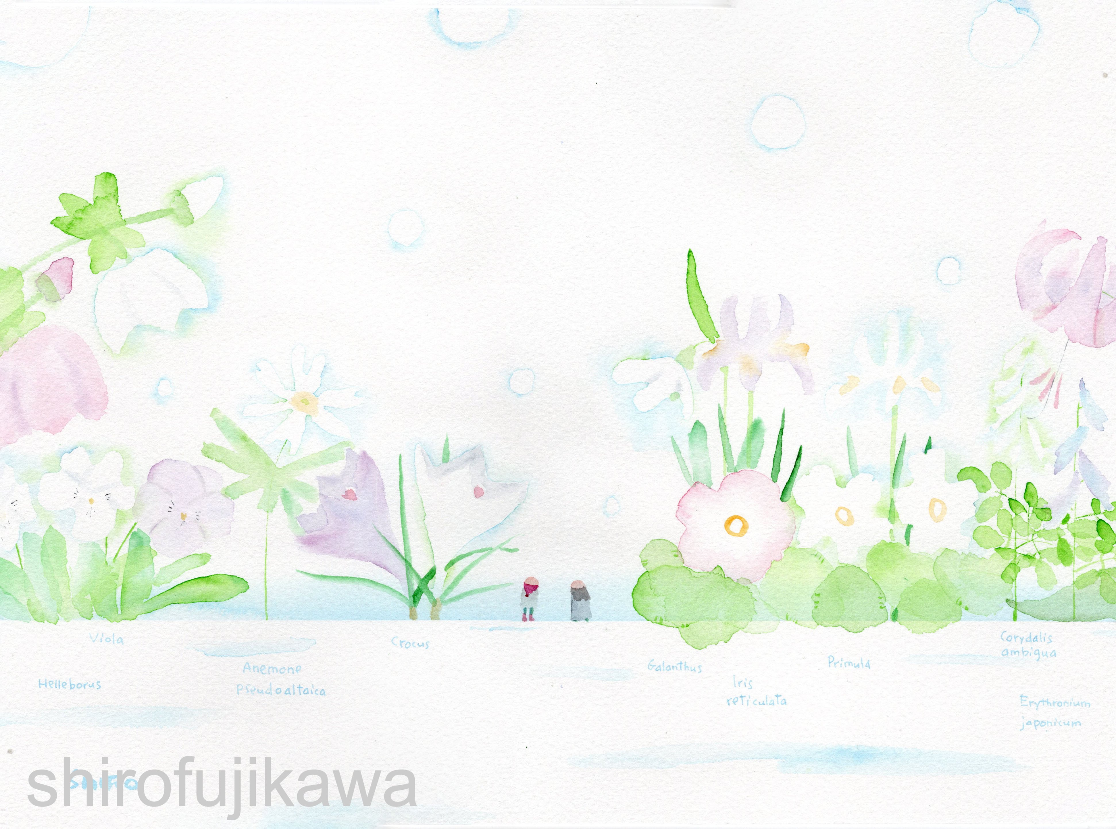 2026年版花カレンダーの2月の絵を横型にしたような形です。早春に咲く花々と、ちょっと季節外れの雪が舞っている様子を描きました。