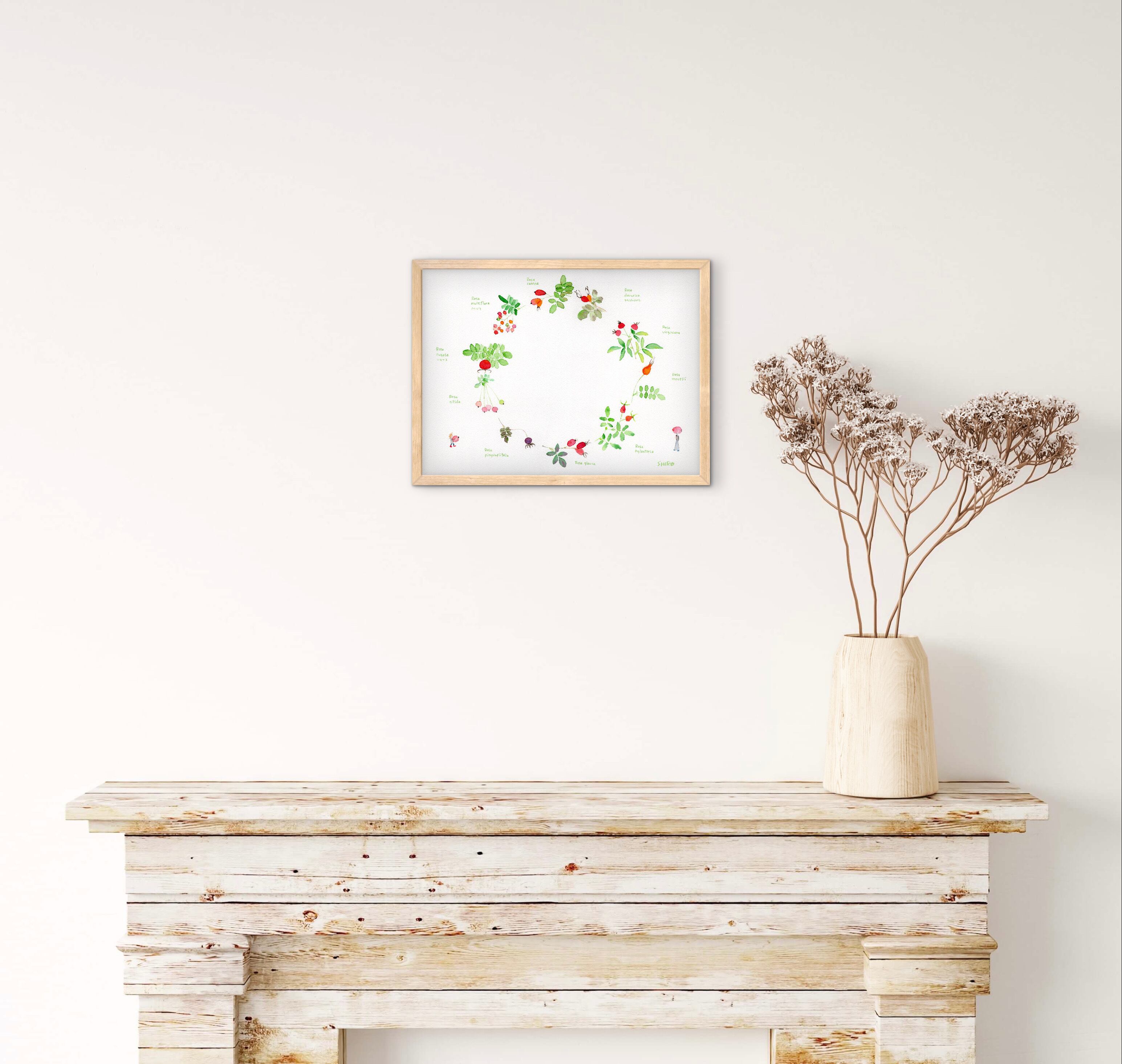 ときどき描く、ローズヒップのリースの絵を横型にしてみました。こうすると人物の配置が決まって、安定感が出ていいかもしれないです。ローズヒップの種類も少し増やしました。