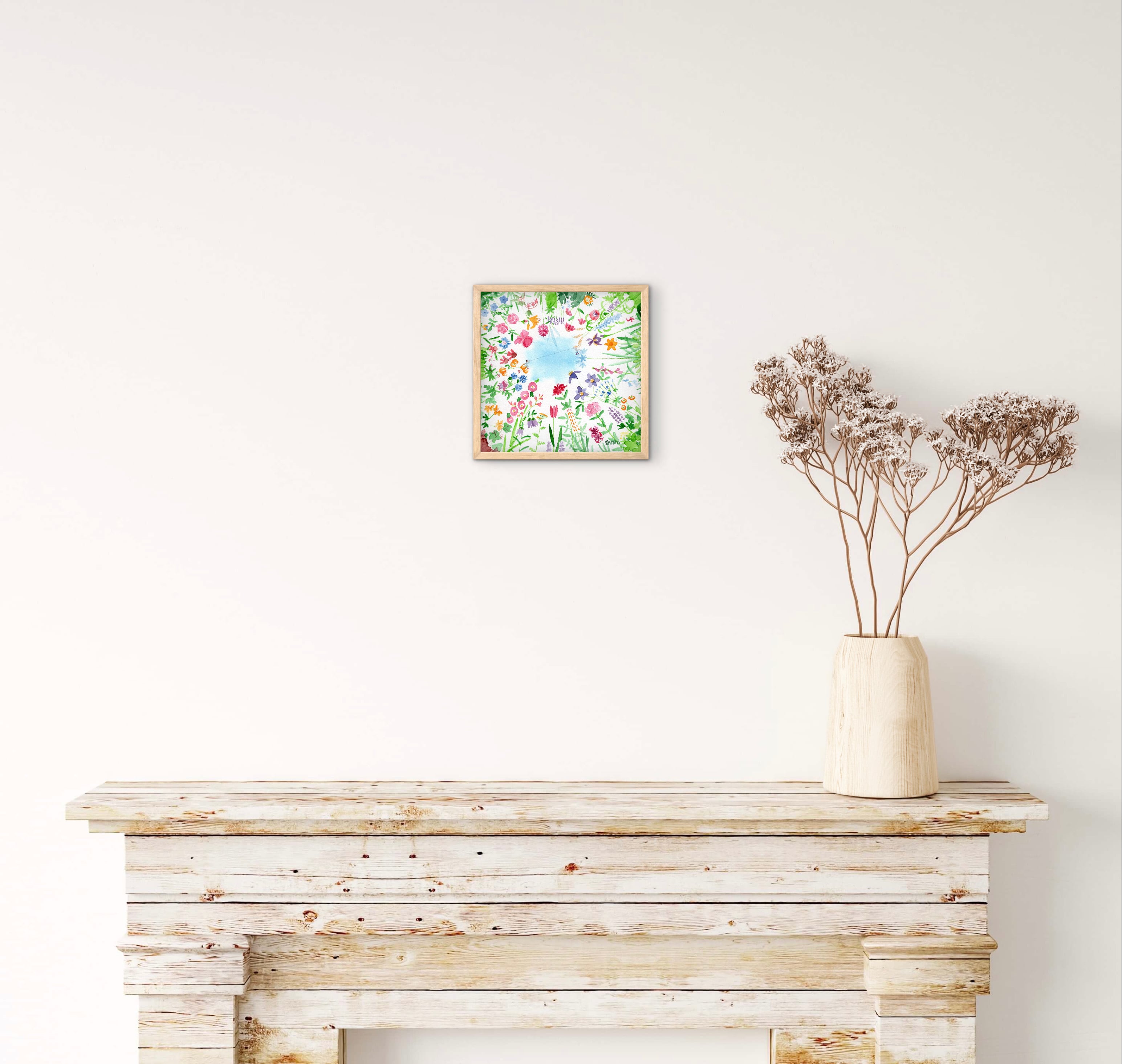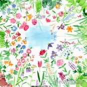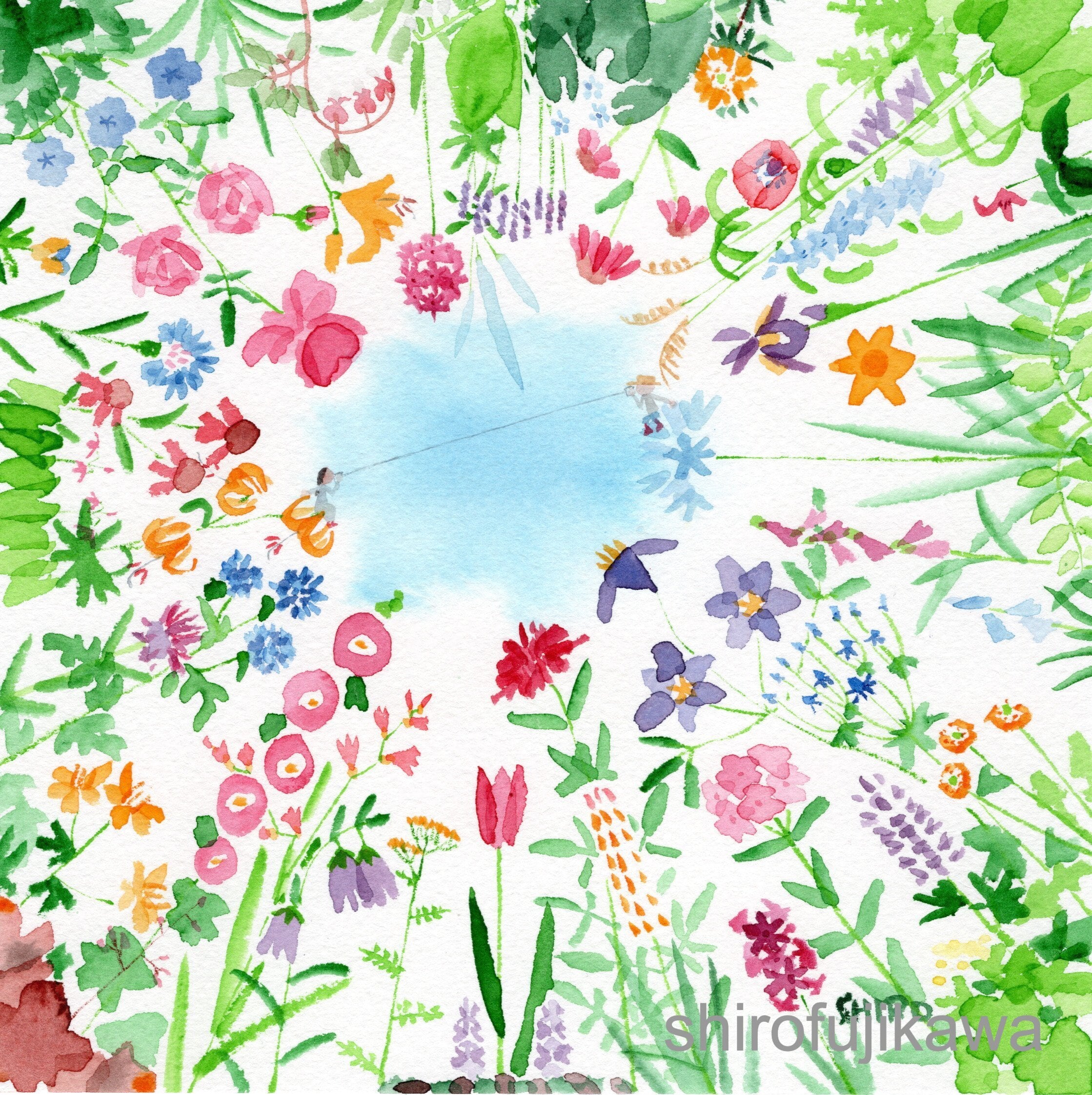 空に向かって勢いよく伸びるようなイメージで花をたくさん描きました。いろいろな季節の花があります。中央で糸電話をしています。