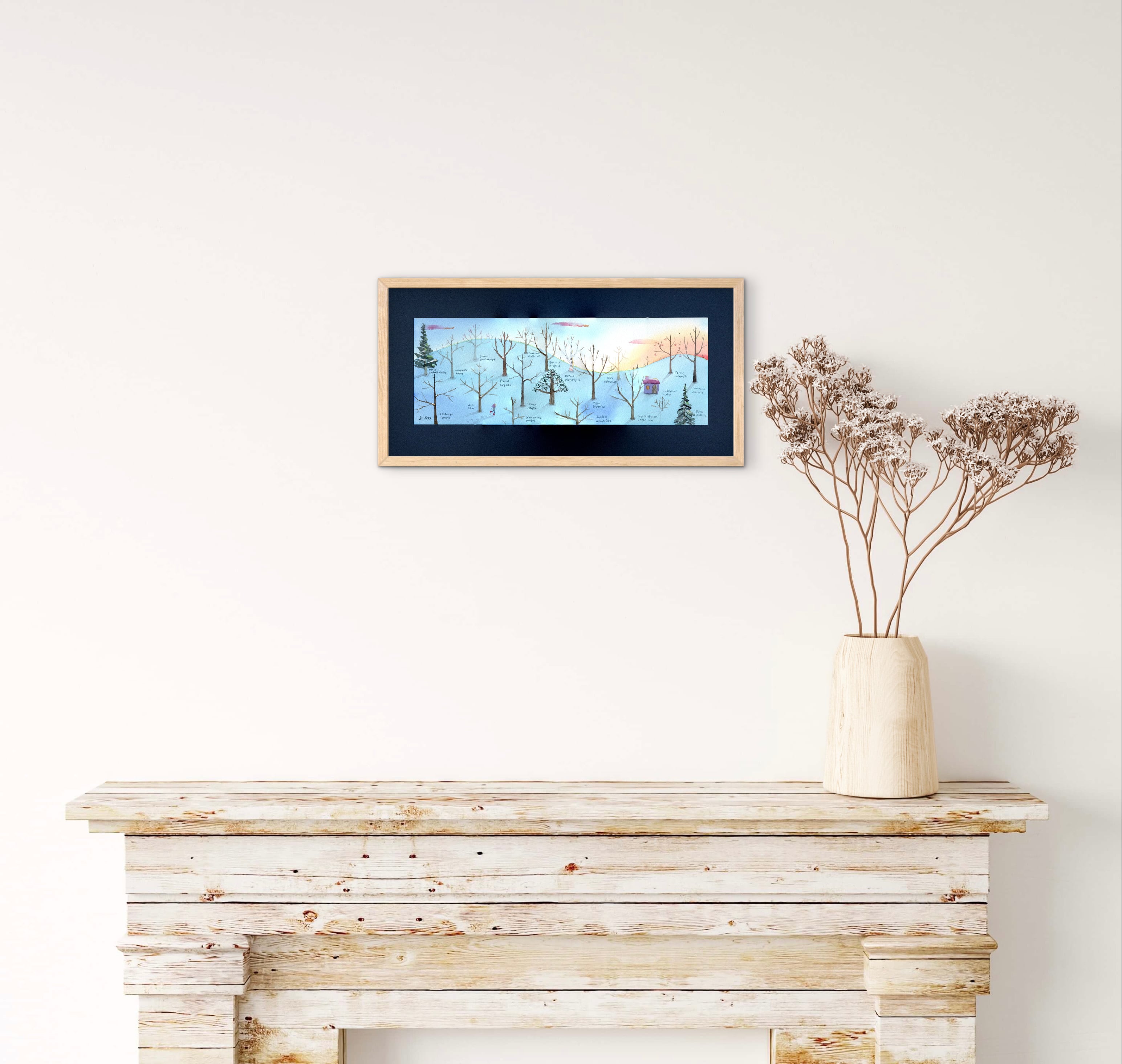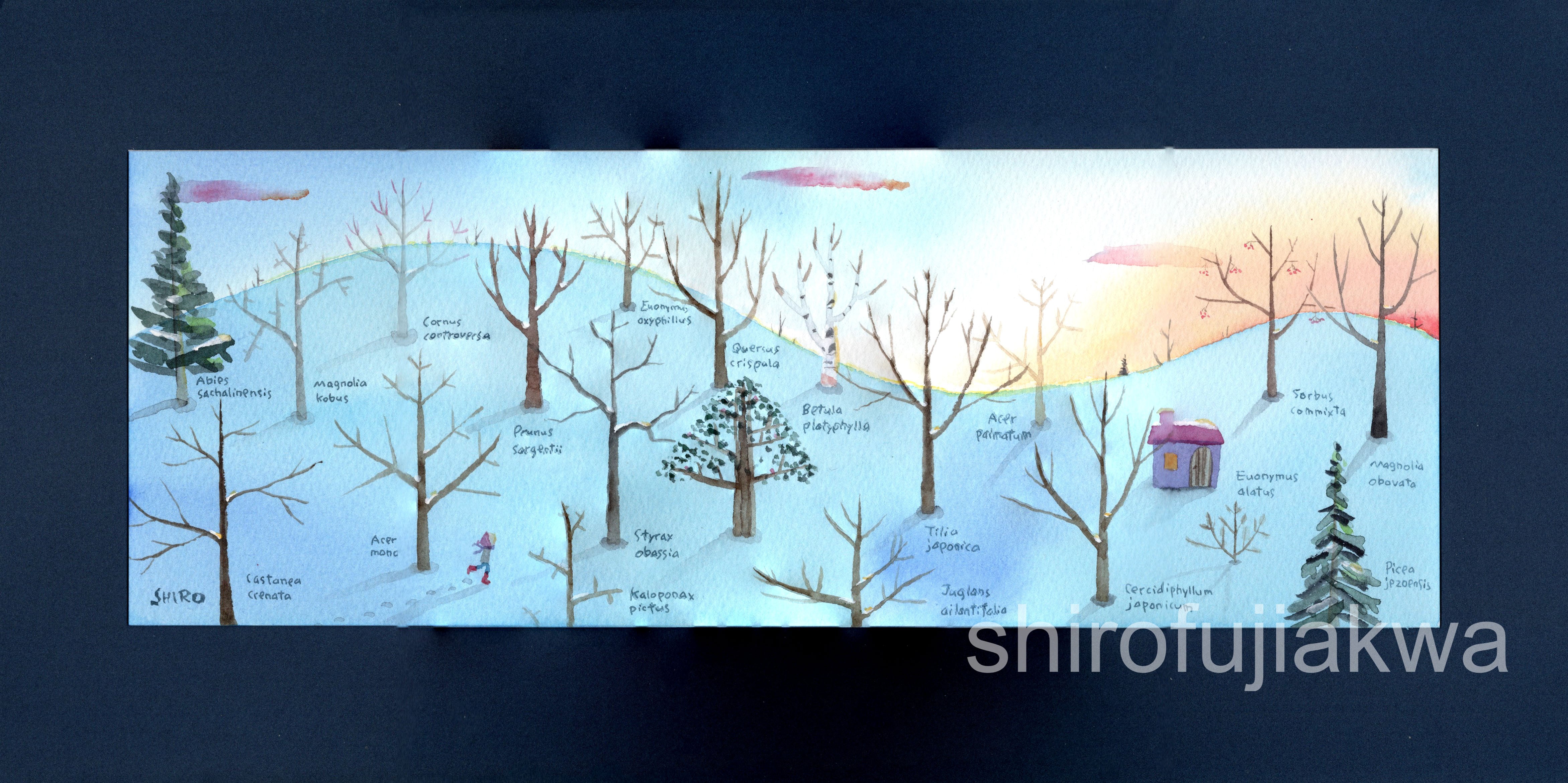 いつも展示に出すタイプの絵の1つです。うちの窓から見える風景をもとに描いています。もちろん実際はもっと鬱蒼としていて空も狭いですが笑。冬は日の沈むのが早く、夕暮れは少し切なくも不思議に穏やかな気持になります。