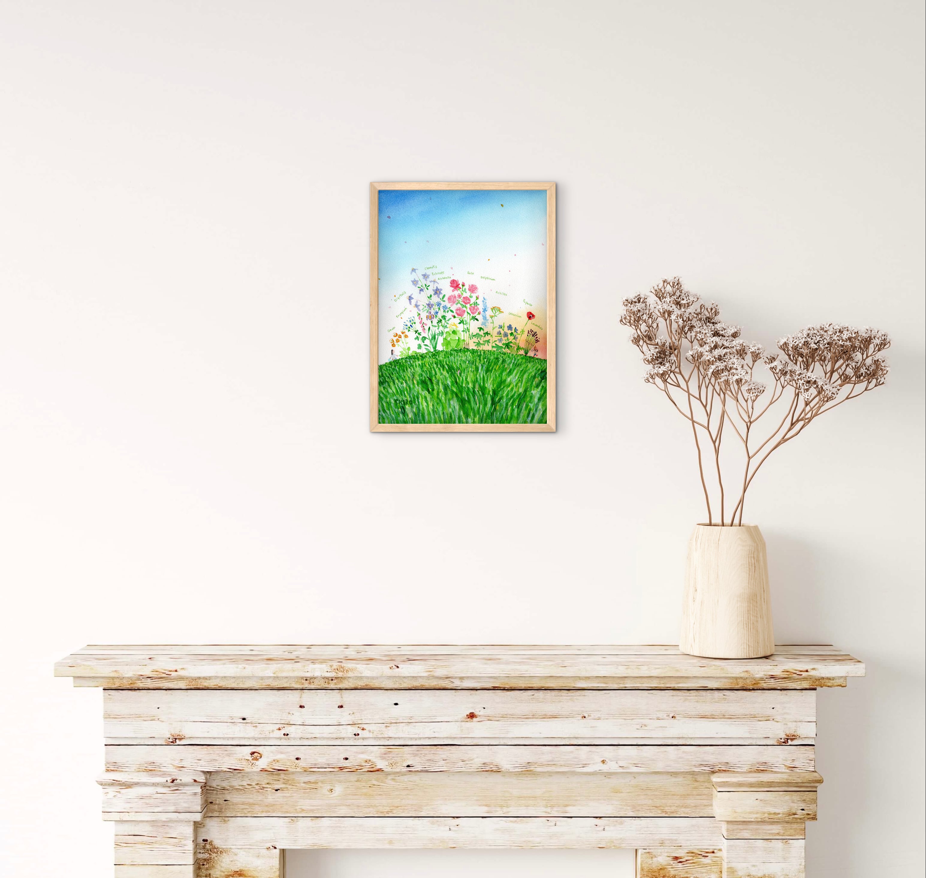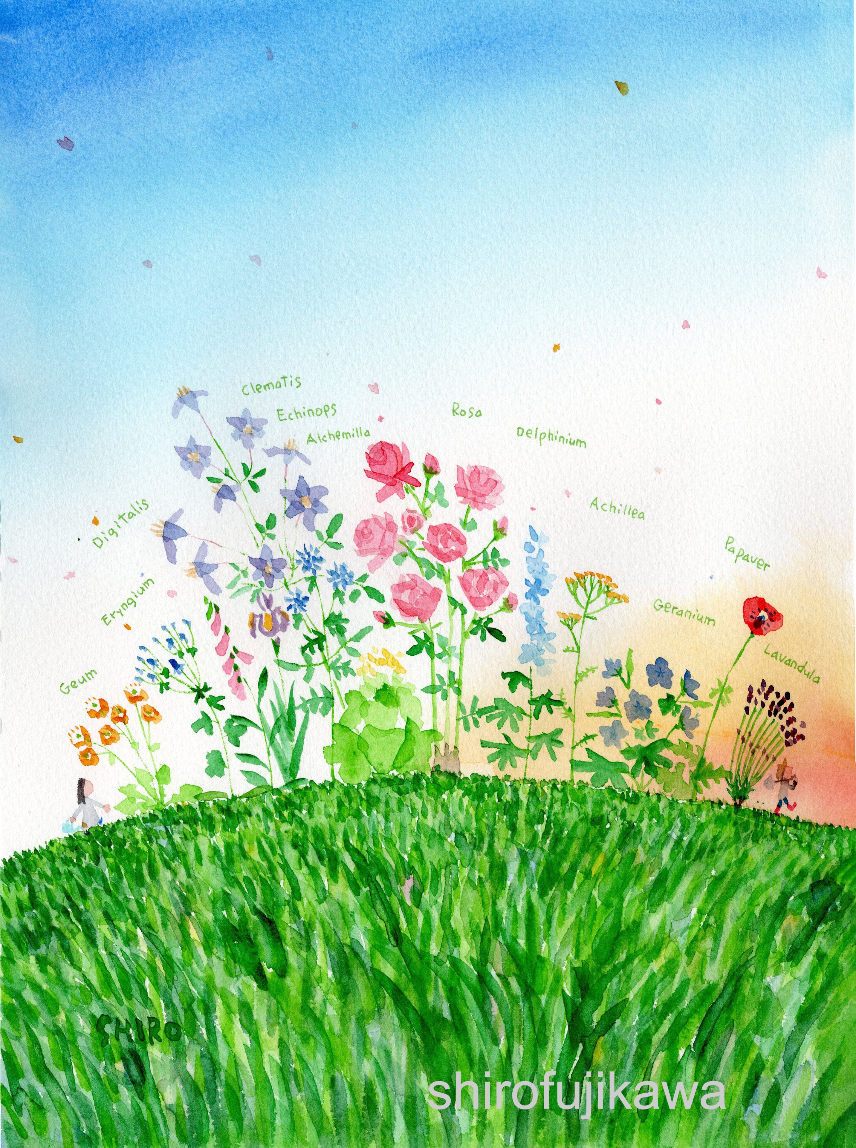 2026年版カレンダーの原画です。初夏の一番花が多い季節。庭仕事も朝から日暮れまで続きます。そんな一日が終わって、家路につくところです。