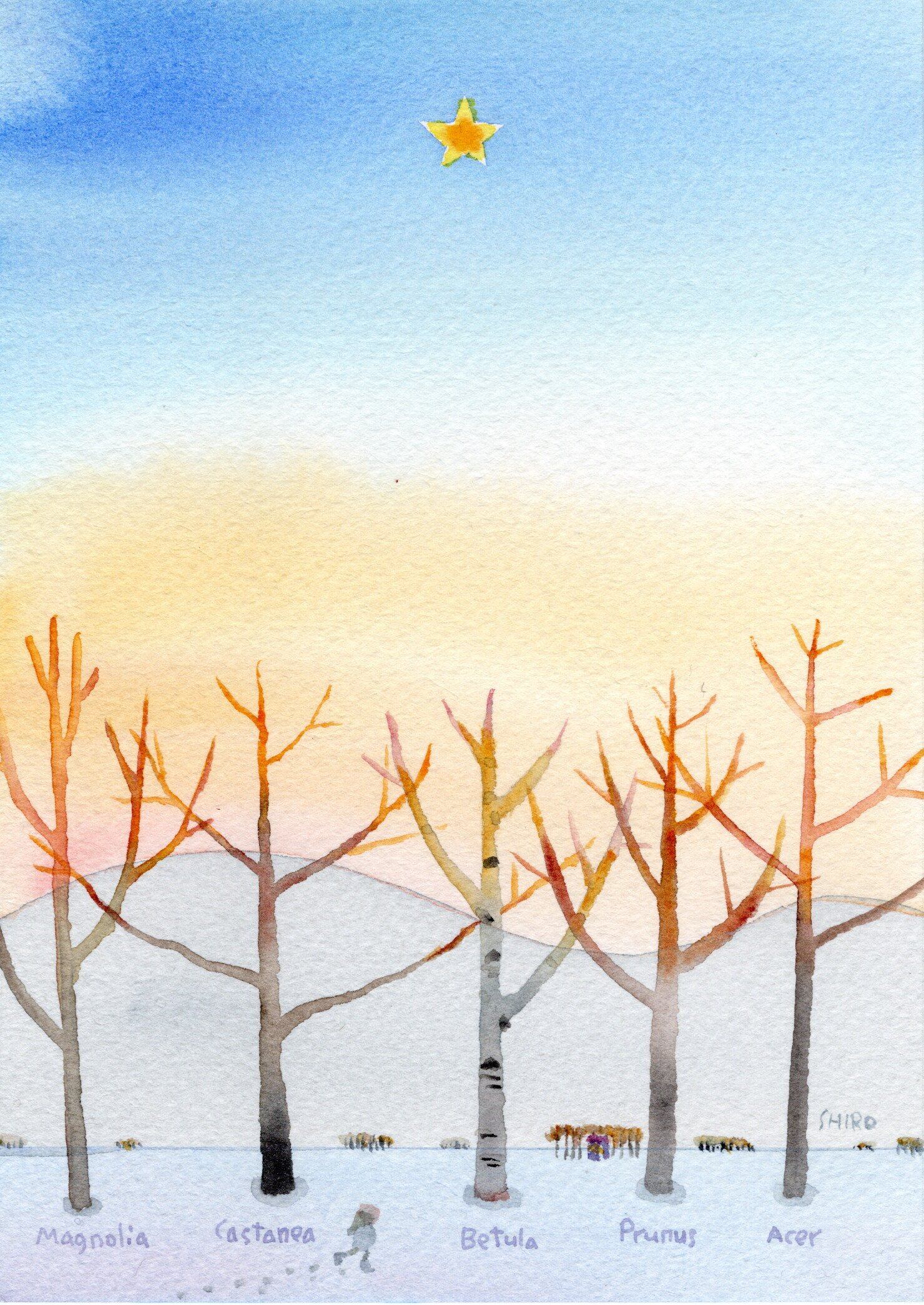 冬の夕暮れ、木立ちの上の方だけ夕日が当たっている様子を描きました。こういう風景を見るとすごく嬉しくなり、いつか描きたいと思っていました。